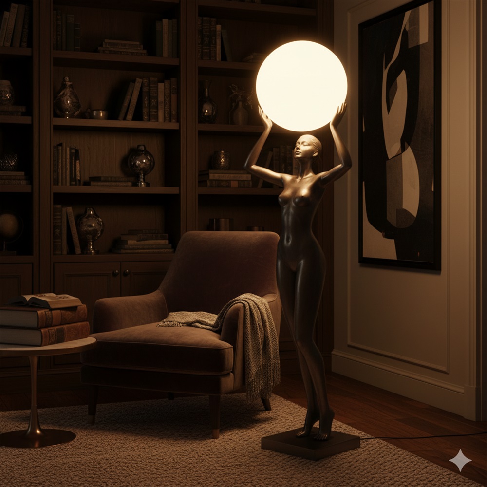 Combine illumination with artistic expression through mannequin lamps, where human-like figures hold light sources in creative ways. Picture a life-sized mannequin with a lampshade as a "hat" or arms cradling glowing orbs, such as elegant female forms in flowing dresses or abstract male silhouettes. These pieces, like a 6-foot bronze-toned mannequin floor lamp, provide both ambient lighting and sculptural interest.